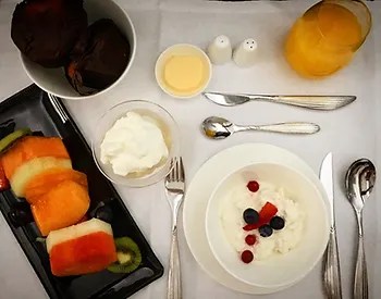 Food was available on demand, not at fixed times. I was given a six-page menu featuring breakfast, dinner, snacks, and drinks—everything from omelets and steaks to cheese platters and fresh juices.